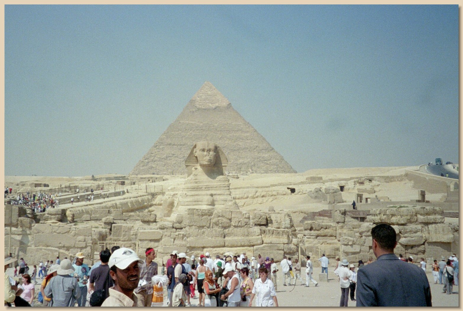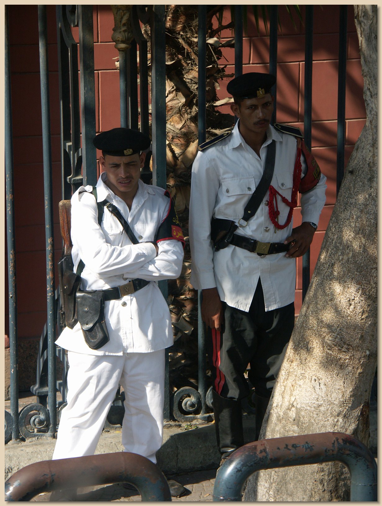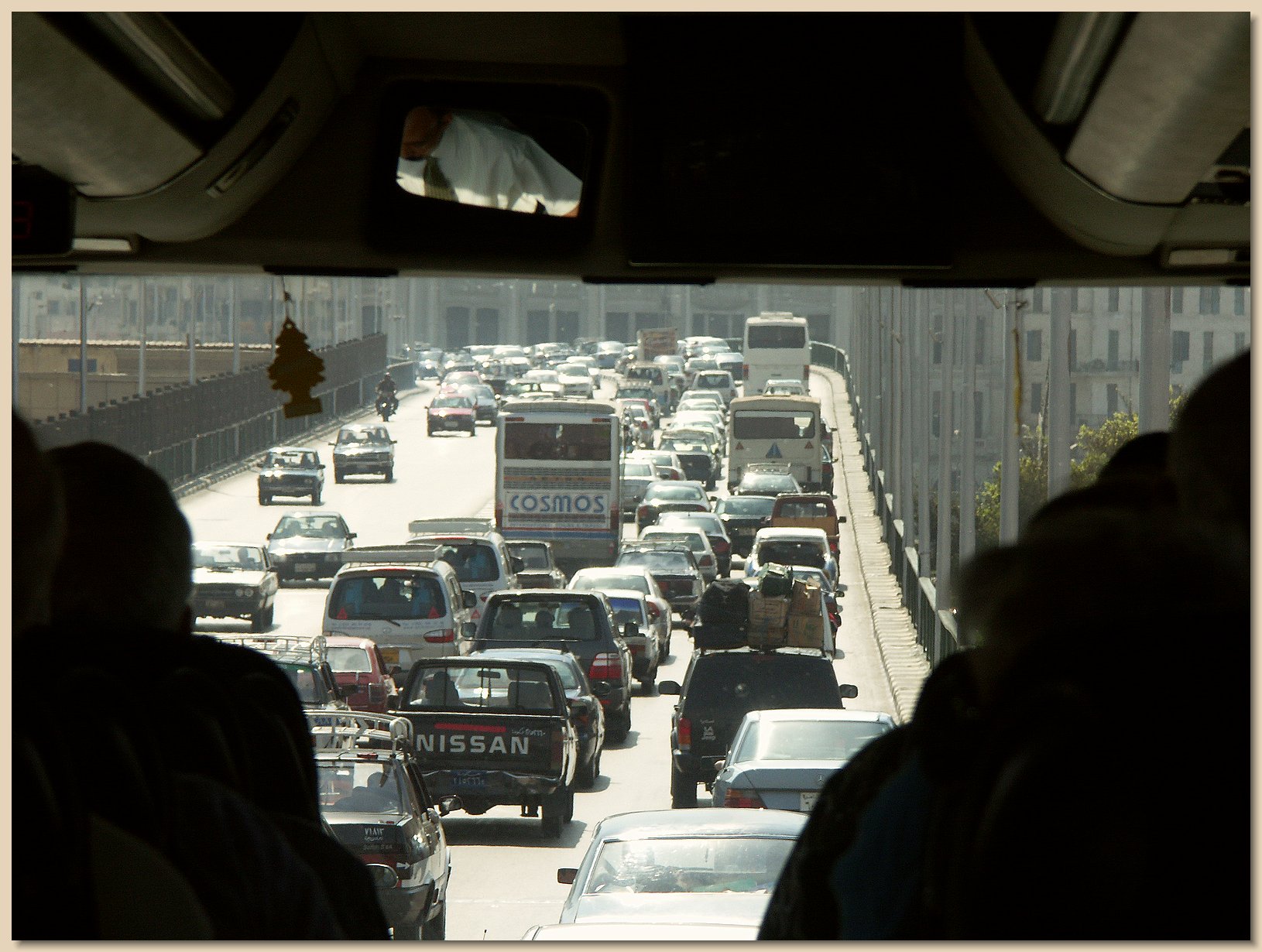 Ihab also explained that Egyptian drivers love their horns. They honk them constantly, for the least reason. Some drivers who can afford them have fancy horns installed which they honk constantly just to show off. In addition to Ihab and the driver, a third Egyptian man was on the bus. He wore a coat and tie, because beneath his coat was partly hidden an automatic weapon. He was our personal security escort in Cairo.