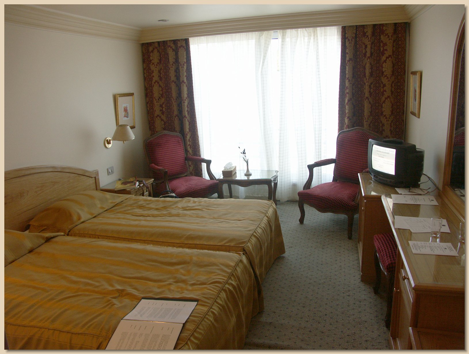 Rooms at the hotel were very nice, but many had only twin beds. In addition, the rooms were noisy. Outside rooms were bothered by the traffic, inside rooms by music and activities at the hotel (which has its own casino that never closes.) The couple who became good friends with Grandma and Grandpa were given a suite when it turned out their room was occupied when they went to it. Grandma and Grandpa themselves had a suite their last night in Egypt.