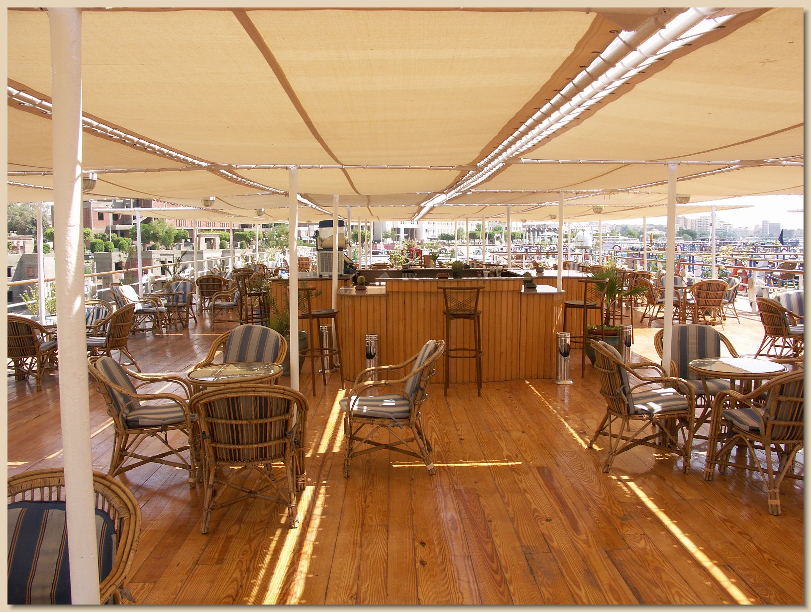 It was very pleasant on the sun deck when the boat was moving, especially at a high speed. Normally, however, the 107-degree temperatures kept passengers off the sun deck, although there was a canvass-covered area around the bar with numerous tables and chairs. But beneath the canvass, although the sun was shaded, it was like an oven when the boat was docked.