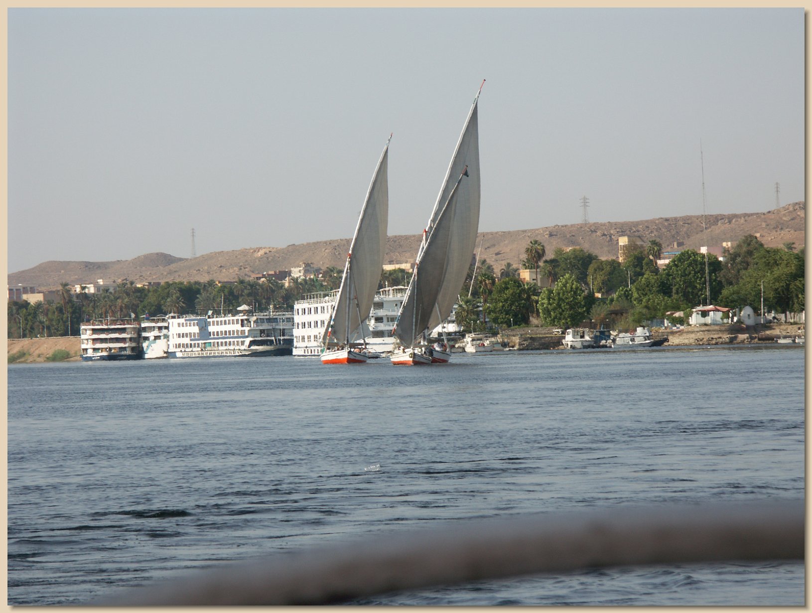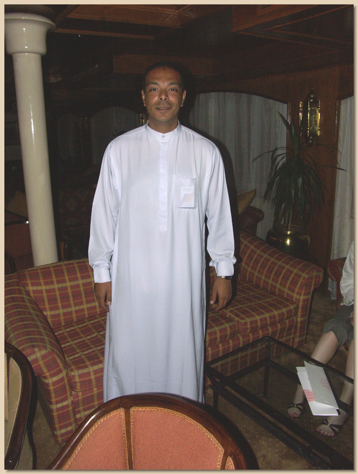 And speaking of being docked, frequently other boats were alongside. On the first day aboard, everyone took a sail aboard a felucca, a traditional Egyptian sailing boat. In order to reach the boat, the passengers had to pass through another boat. Grandpa Roy noticed after the felucca ride that the schedule for the day on that boat was printed in two languages: Czech and German, both of which he recognizes readily. This particular boat had a beautiful reception area, as can be seen in the photo.