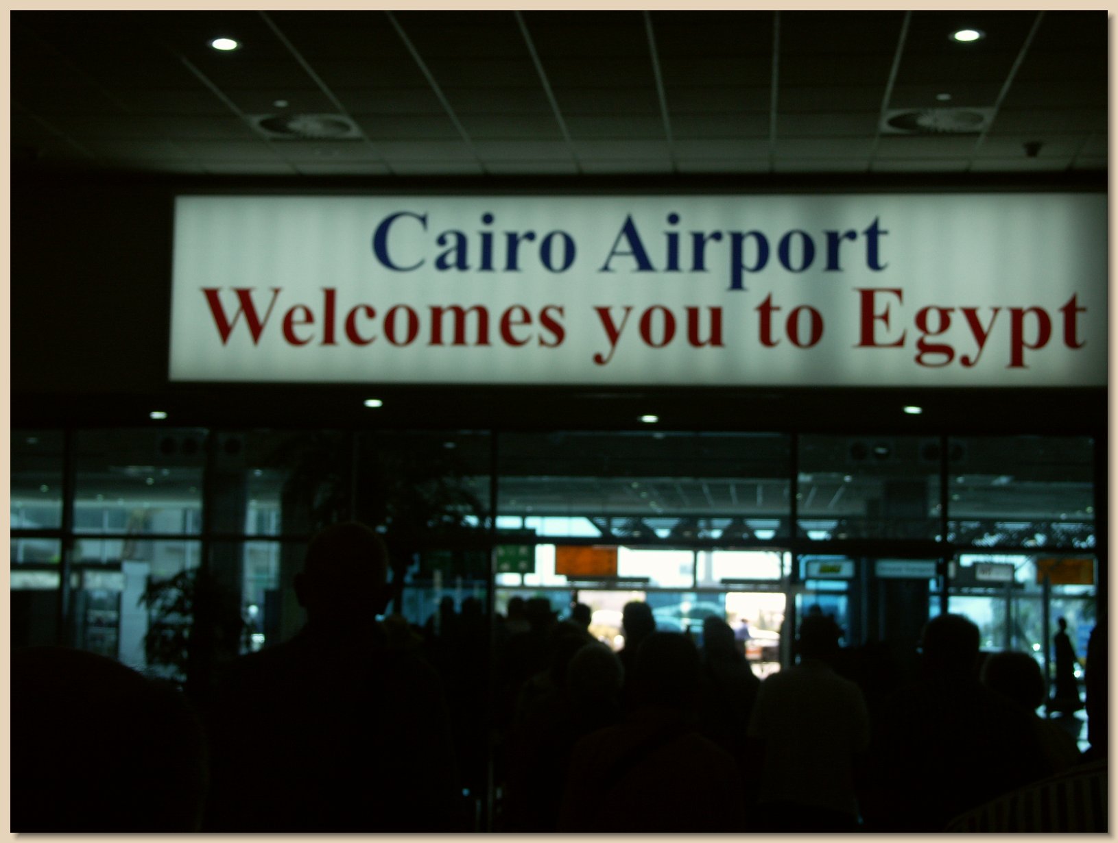 Finally, on 10 September 2005, the appointed time arrived and Grandma and Grandpa were off to New York by bus to catch their 11-hour Egyptair non-stop flight to Cairo. There was a short wait in line at the Egyptair counter to check bags and get boarding passes, and then a quick trip through security, or so it was thought. About an hour before takeoff, an Egyptian security team had everyone exit the Egyptair waiting area and line up so they could check everyone’s carry-on bags by hand, although they already had been X-rayed by the U.S. security personnel. They went through some thoroughly; other bags, such as Grandpa’s camera case, they only opened and looked inside. The airplane was a Boeing 777 wide-body jet, which Grandpa hopes has better maintained engines and avionics than the passenger cabin is maintained.