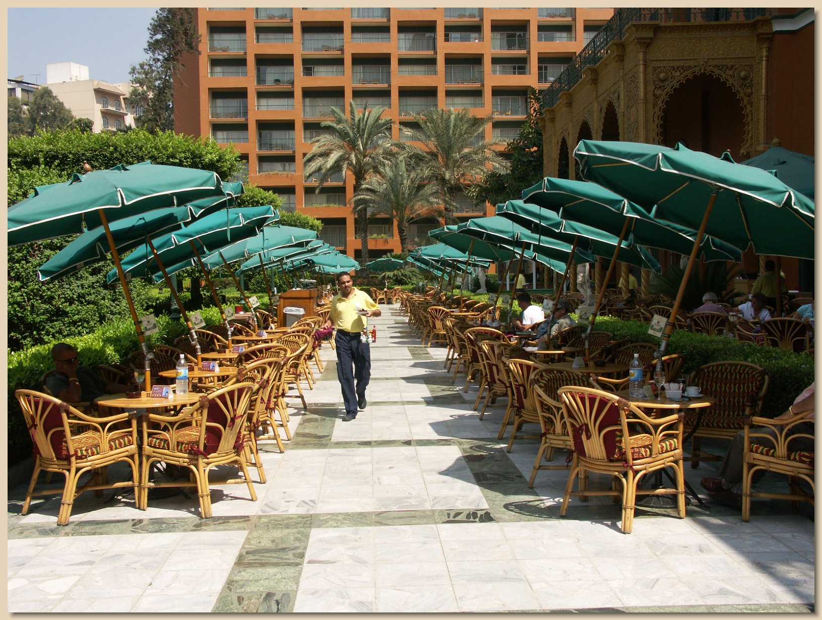 A large buffet breakfast with good coffee and a fresh large bottle of water for every Grand Circle traveler was included each morning at the Marriott. The water came in especially handy during sightseeing trips that were outdoors, such as the pyramids and the Sphinx. A cook prepared omelets or fried eggs to order at breakfast and there were runny scrambled eggs. There were three types of sausage, but none with pork. Jellies, jams and butter were imported from Western Europe. There was a large variety of breads, fruits and cheeses, plus four types of juice.