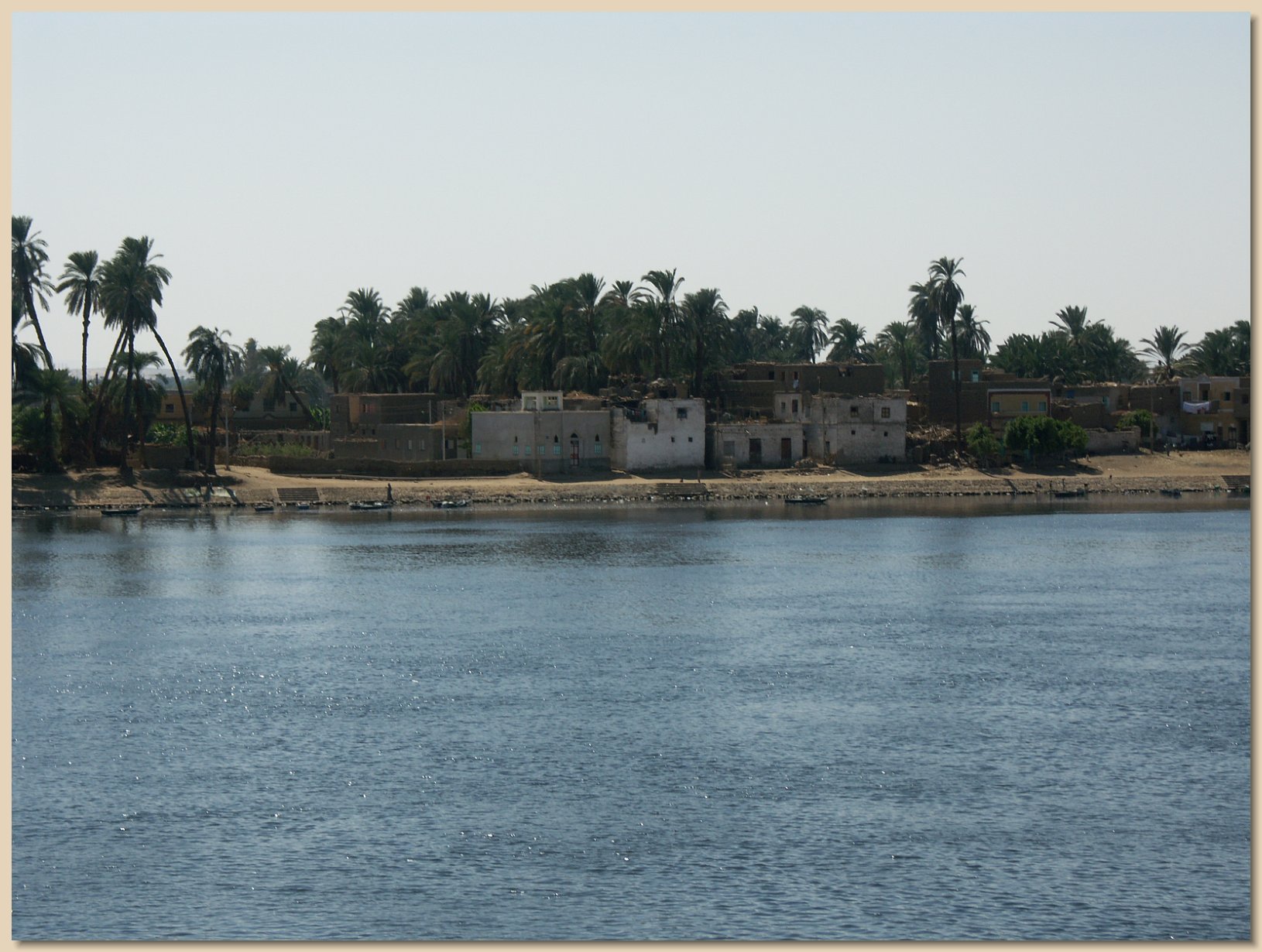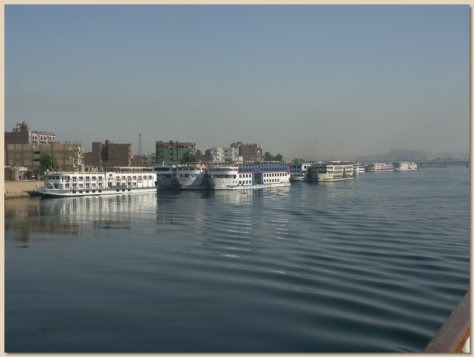 The boat had five decks: a lower deck with small gift shops and the dining room, three decks of cabins and other facilities and the sun deck at the top which had a small pool mostly suitable for keeping cool. There were bars both on the sun deck and on the lounge deck (the uppermost deck with cabins) where one could charge reasonably priced drinks to their room. The dining room on the boat had open seating, but most passengers by that time had made friends and those friends tried to sit together at lunch and supper. Breakfast was a buffet that became monotonous after a few days, although freshly fried omelets and eggs were available. Lunch and supper, however, were very good. One evening it was all Egyptian food. Grandma and Grandpa had a wonderful waiter, whose name was Mossad, and although he wasn’t supposed to according to the guidance, Grandpa Roy slipped Mossad a small, extra tip at the end of the cruise.