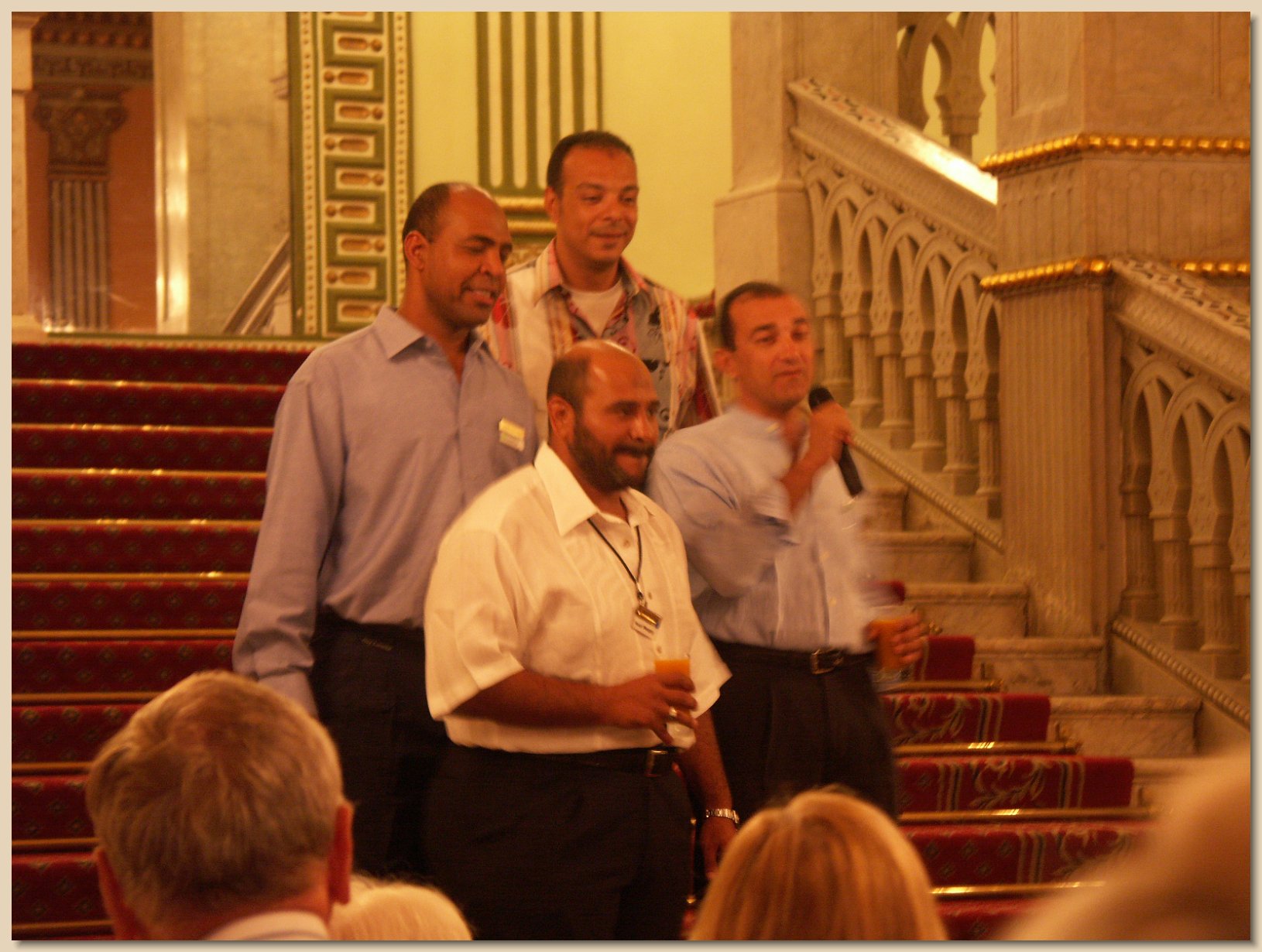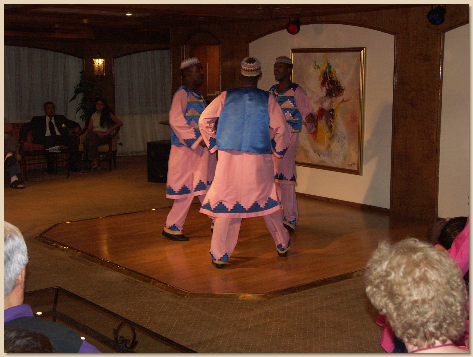 The first night’s entertainment was Nubian dancers. The single “warrior” at the end was especially humorous when he tried to teach some of the passengers his chants and cries. On another evening, there was a “whirling dervish” and a “horse” that nosed around the audience. On yet another evening, there was music and a dance contest. On Egyptian Night, everyone was encouraged to wear something Egyptian. Grandma and Grandpa wore Egyptian head coverings. In addition, each evening there was a short port briefing before supper to explain the schedule for the following day.
